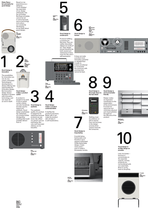 These ten principles defined Dieter Rams' approach to 'good design'. Each of the hundreds of products he developed during forty years with Braun, was unerringly elegant and supremely versatile. Units were made in modular sizes to be stacked vertically or horizontally. Buttons, switches and dials were reduced to a minimum and arranged in an orderly manner. Rams even devised a system of colour coding for Braun's products, which were made in white and grey. The only splash of colour was the switches and dials.