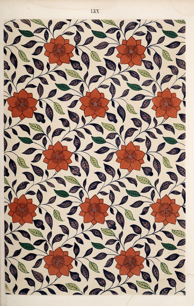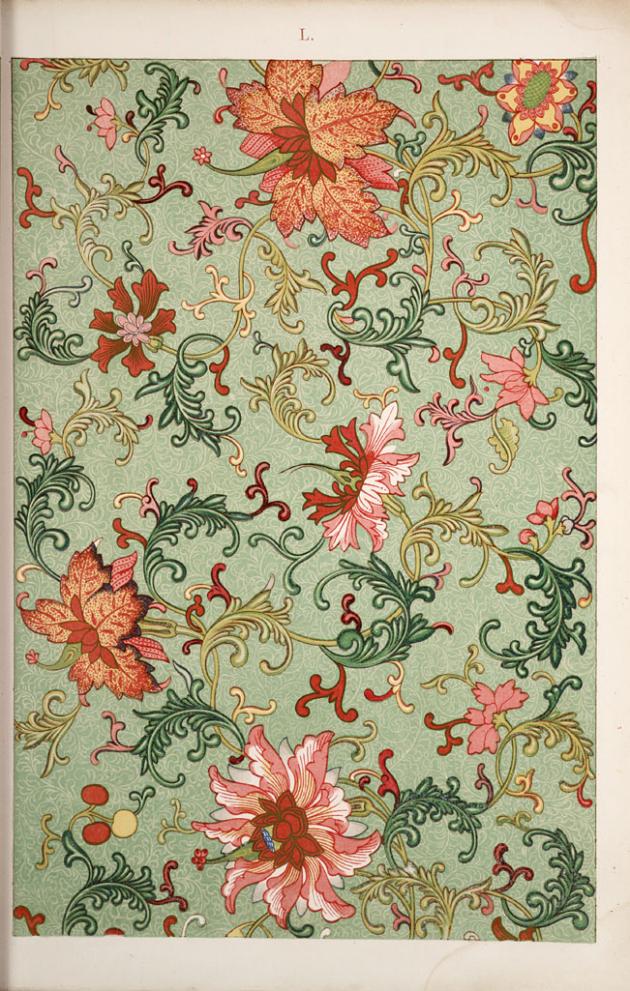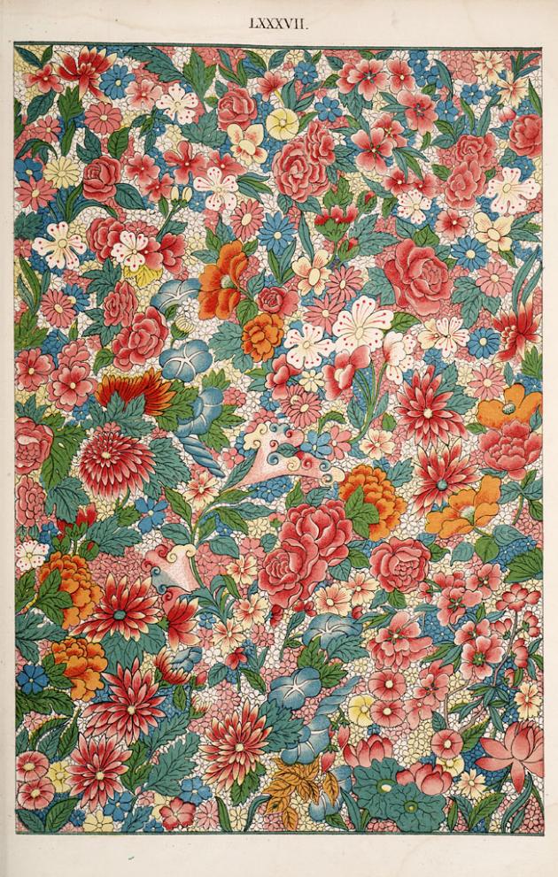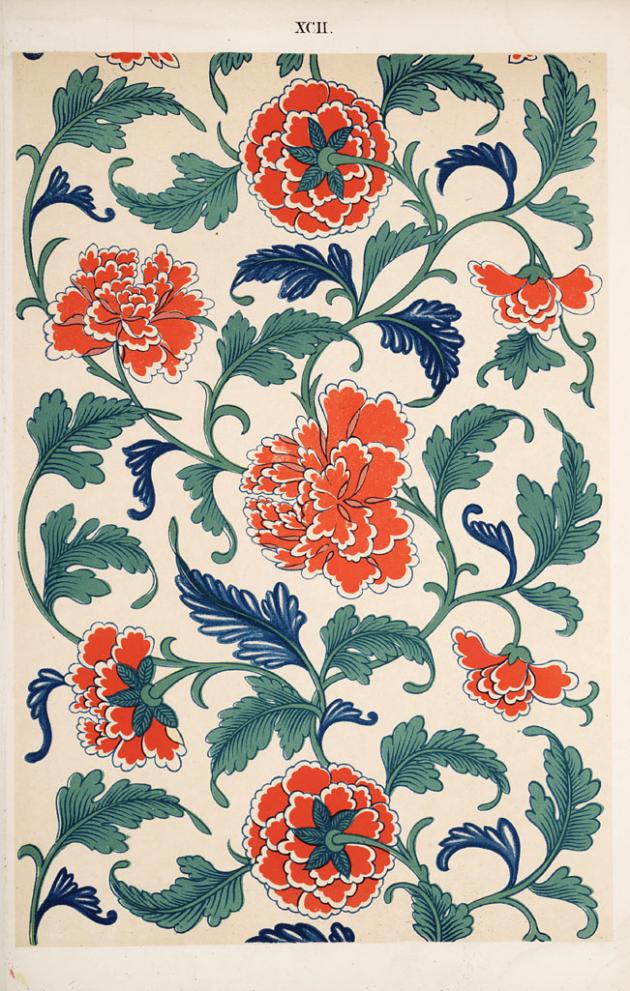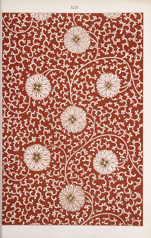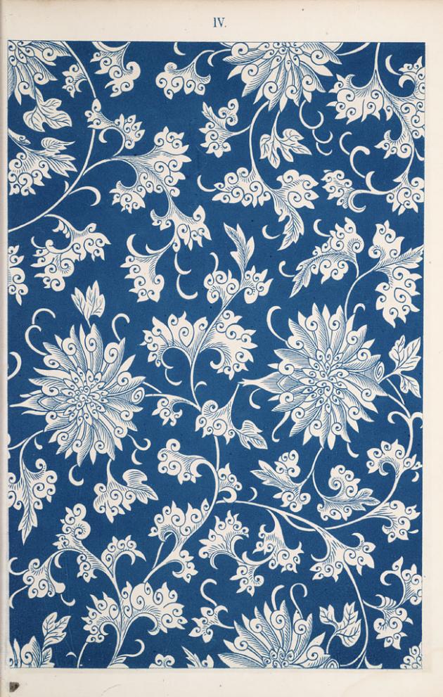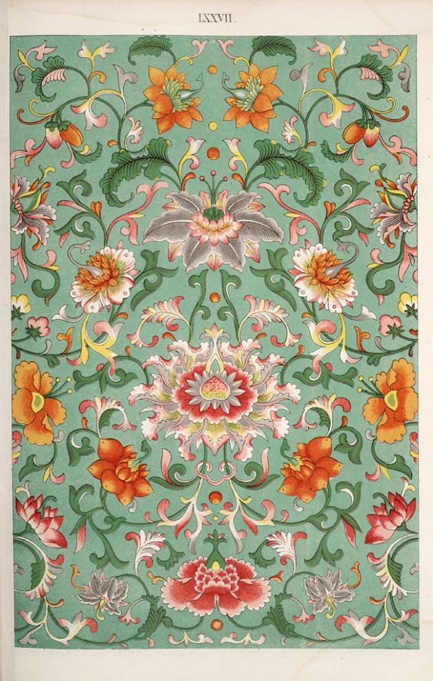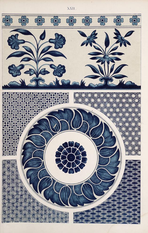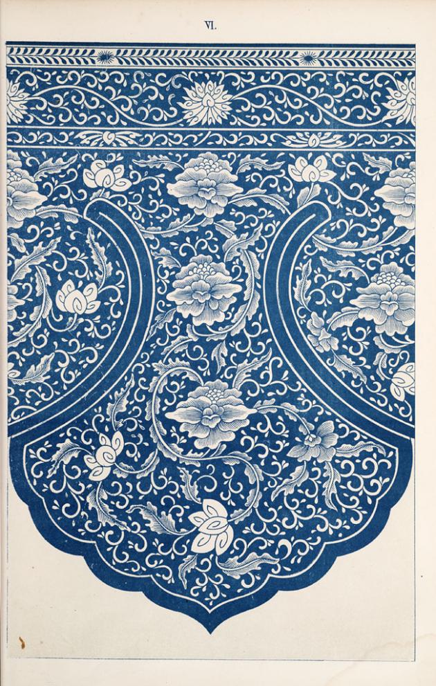"We have long been familiar with the power of the Chinese to balance colours, but we were not so well acquainted with their power of treating purely ornamental or conventional forms ; and in the chapter in the Grammar of Ornament on Chinese Ornament I was led, from my then knowledge, to express the opinion that the Chinese had not the power of dealing with conventional ornamental form : but it now appears that there has been a period in which a School of Art existed in China of a very important kind. We are led to think that this art must in some way have had a foreign origin; it so nearly resembles in all its principles the art of the Mohammedan races, that we may presume it was derived from them. It would be no difficult task to take a work of ornament of this class, and, by simply varying the colouring and correcting the drawing, convert it into an Indian or Persian composition. There is of course, in all these works, something essentially Chinese in the mode of rendering the idea, but the original idea is evidently Mohammedan. The Moors of the present day decorate their pottery under the same instinct, and follow the same laws as the Chinese obeyed in their beautiful enamelled vases. The Moorish artist takes a rudely–fashioned pot or other object, and by a marvellous instinct divides the surface of the object, 'by spots of colour, into triangles of proportionate area, according to the form and size of the object; these triangles are then crossed by others."