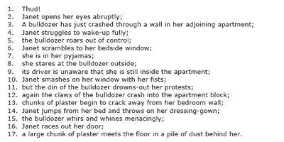 Accordingly a beatscript is a scripting aid used for describing story ideas. It offers a level of detail not afforded by the standard feature–film screenplay format. This makes it especially useful for describing short–film, animation and short sequence ideas. Its structure is focused on action rather than thought. This allows screenwriters to organise their narrative ideas in a concise manner that is conducive to screen presentation. It prevents authors from describing non–tangible, subjective elements that are unable to be effectively represented in screen form. Beatscripts are used as the starting point for generating storyboards and shootingscripts. While beats are used to describe action, shots are used to describe the visual screen presentation of action. There isn't a direct relationship between individual beats and shots. In situations where an event is significant in a sequence, a single beat might equate to a single shot (and is likely to be framed as a close–up). Whereas where a series of beats might describe a general idea, these beats might collectively equate to a single shot (which is likely to be framed as a long–shot). The specific visual treatment of beatscript ideas is usually determined by the cinematographer or director (which on small projects is usually the same person)."
