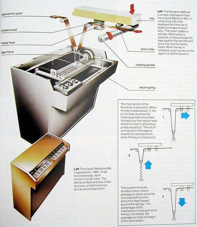 "Arguably the original multi–sampler, each key on the Mellotron had recordings of real instruments on a piece of magnetic tape under each note of the 3–octave keyboard and each key had its own pinch roller and playhead. When a key was pressed, the pinch roller enaged with a master capstan wheel and dragged the key's tape over a playhead."