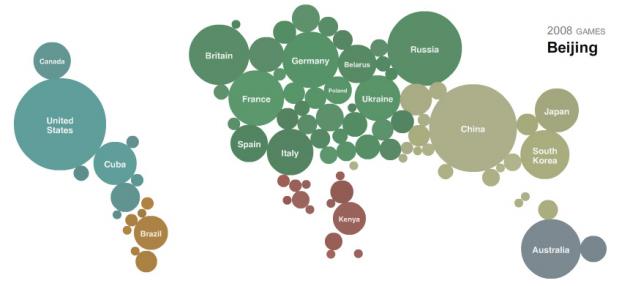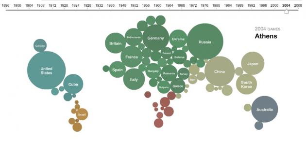 "Circles are sized by the number of medals that countries won in summer Olympic Games. Use the slider to view past Olympics, or click on a country to display a list of its medal winners."