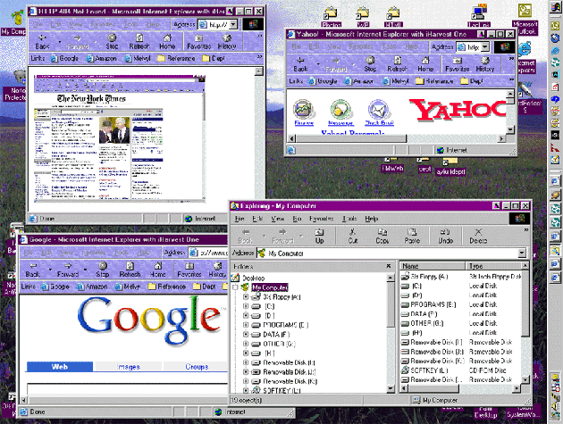 "Unlike a perspective painting or three–dimensional computer graphic, this windowed interface does not attempt to unify the space around any one point of view. Instead, each text window defines its own verbal, each graphic window its own visual, point of view. Windows may change scale quickly and radically, expanding to fill the screen or shrinking to the size of an icon. And unlike the painting or computer graphic, the desktop interface does not erase itself. The multiplicity of windows and the heterogeneity of their contents mean that the user is repeatedly brought back into contact with the interface, which she learns to read just as she would read any hypertext. She oscillates between manipulating the windows and examining their contents, just as she oscillates between looking at a hypertext as a texture of links and looking through the links to the textual units as language.